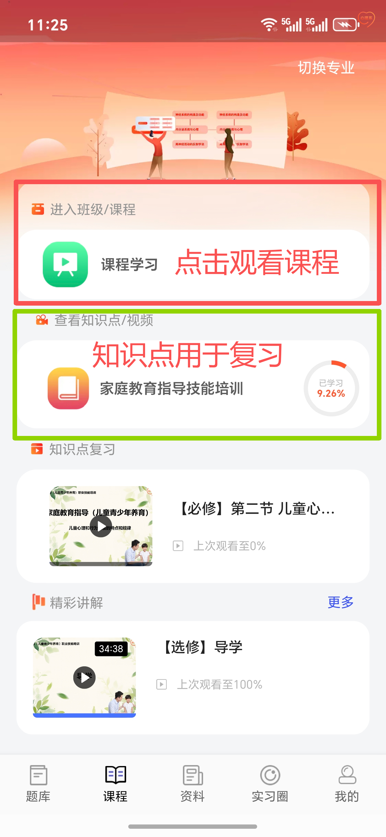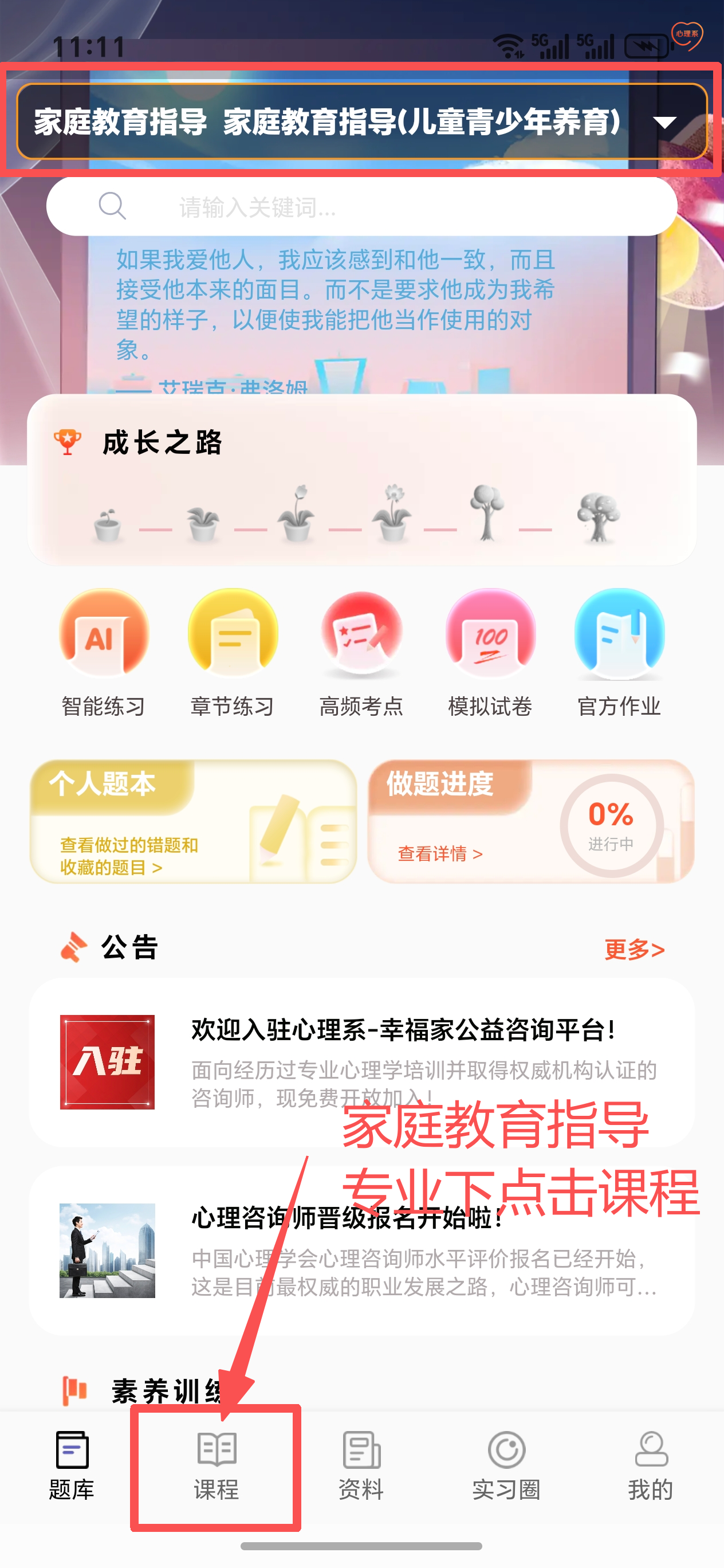 登录后在首页顶部切换专业,选择后点击确定。例如:家庭教育指导。