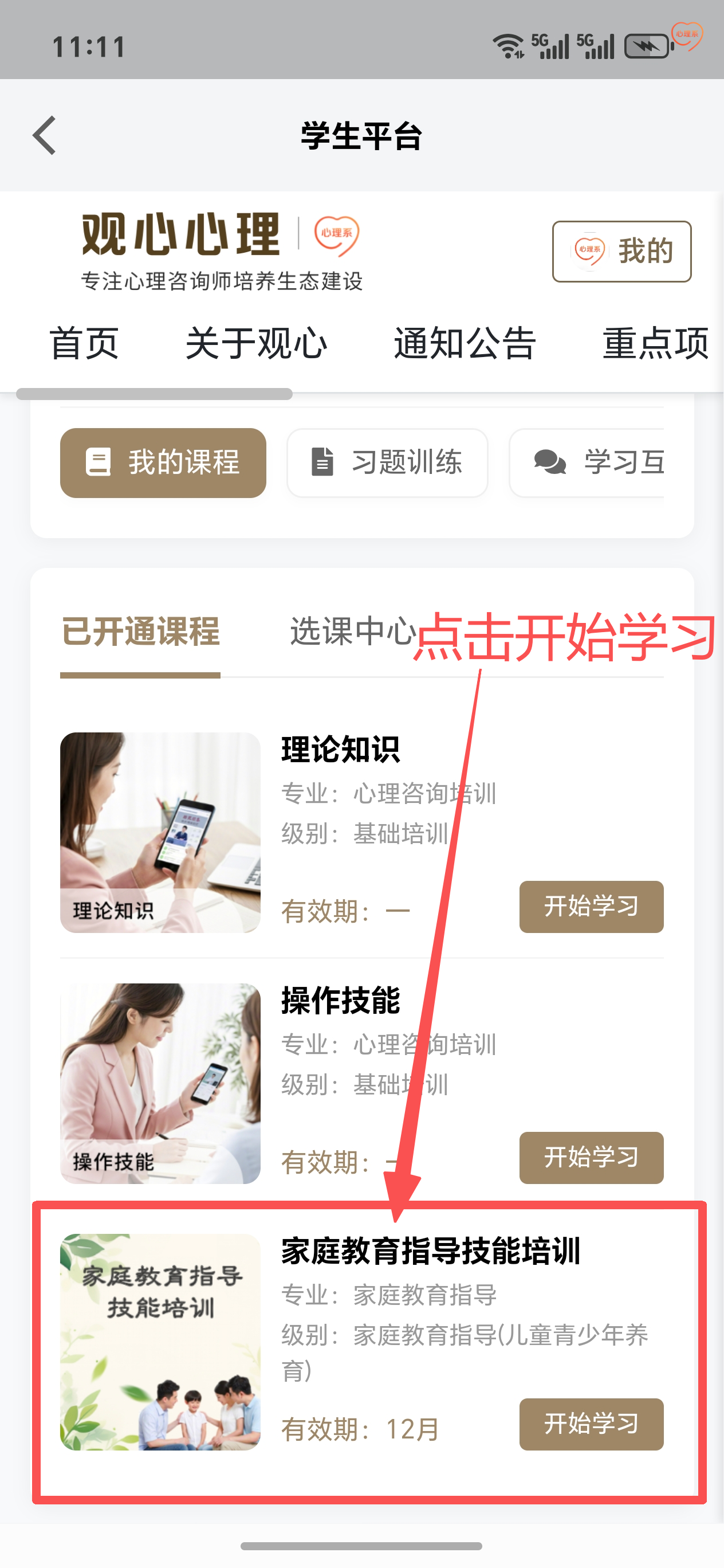 课程学习-课程中心-点击家庭教育指导课程,观看课程视频。