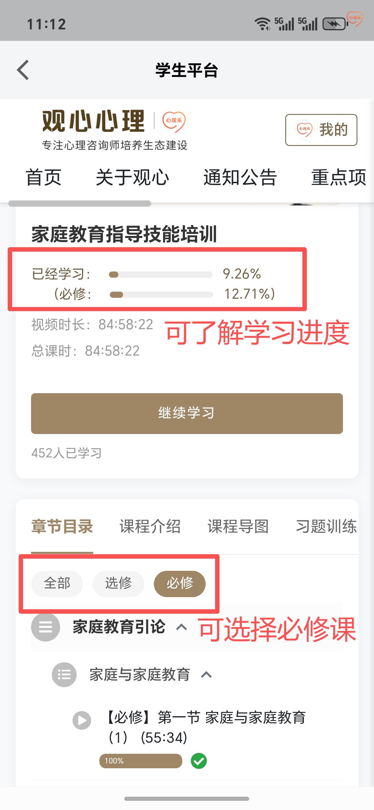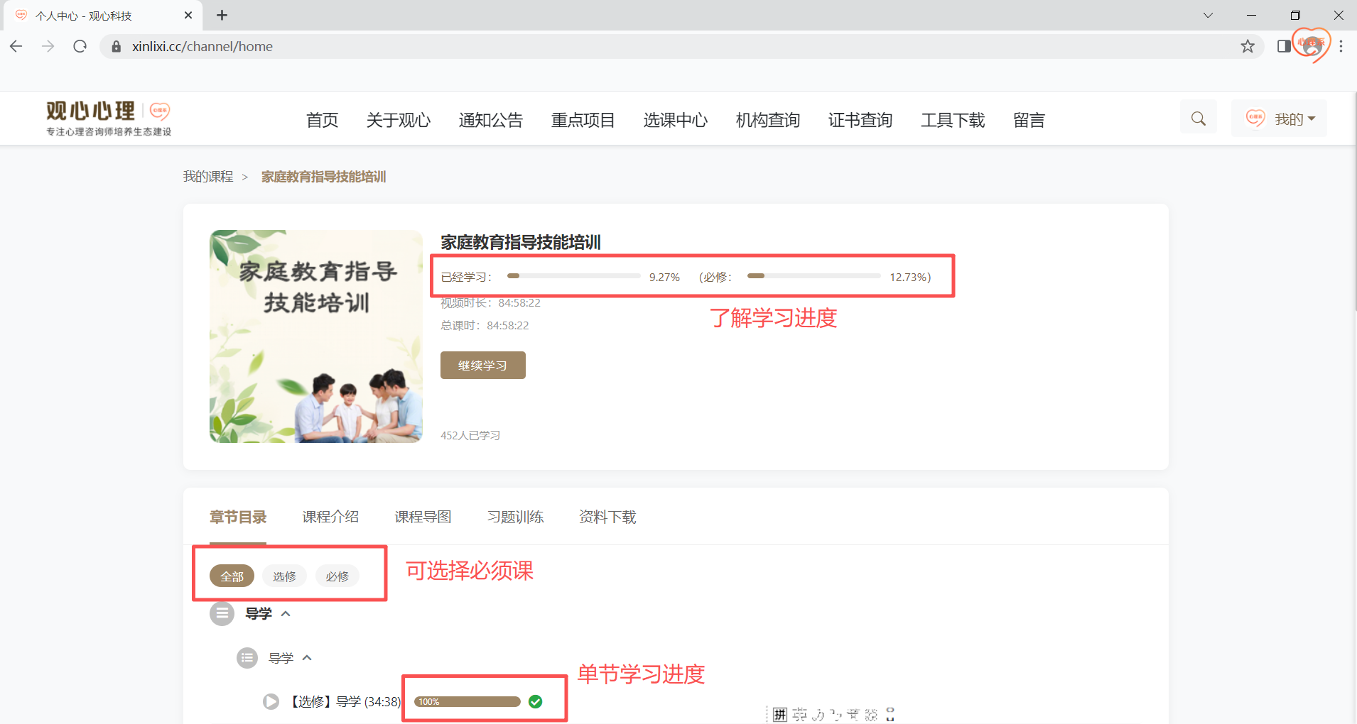 进入课程页面后,课在【已经学习】了解学习进度,课程单节目录下可以根据需要选择【必修】【选修】,在单节视频后可查看详细学习进度。
