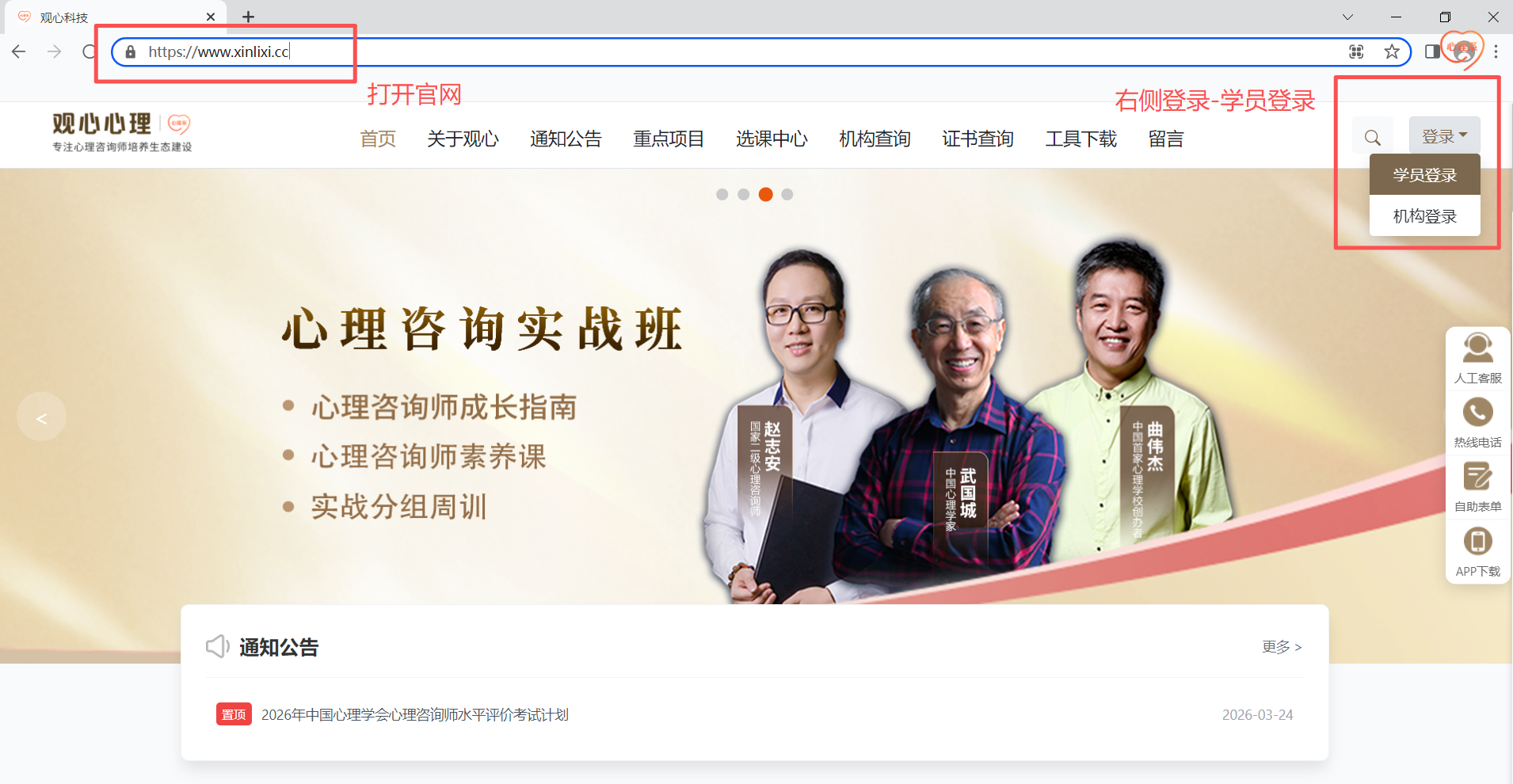 在导航栏右侧点击登录-选择学员登录