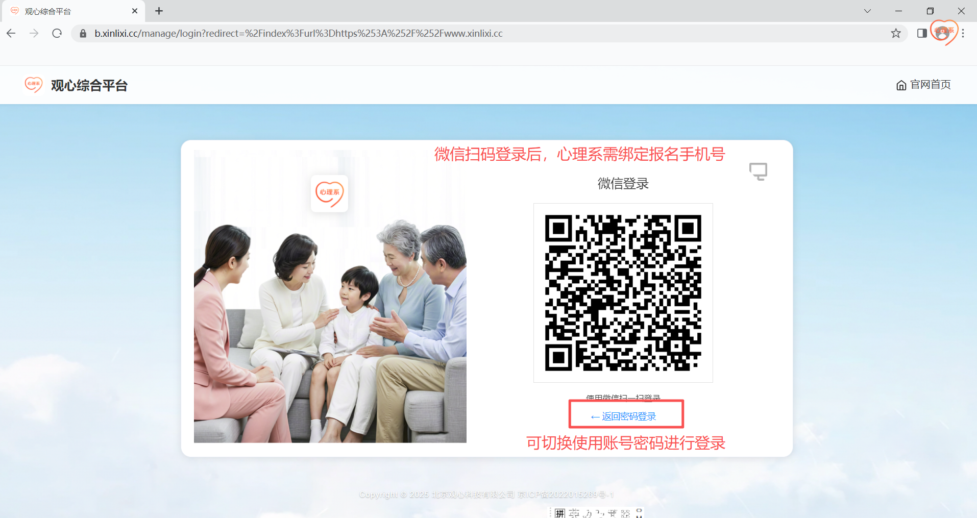 如已有心理系APP账号的学员(绑定手机号为报名手机号),微信扫码登录即可。
